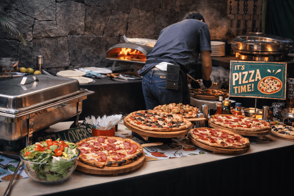 Pizzas recién hechas, al instante y frente a tus invitados. Sorprende con un buffet único que convertirá tu evento en una experiencia inolvidable.